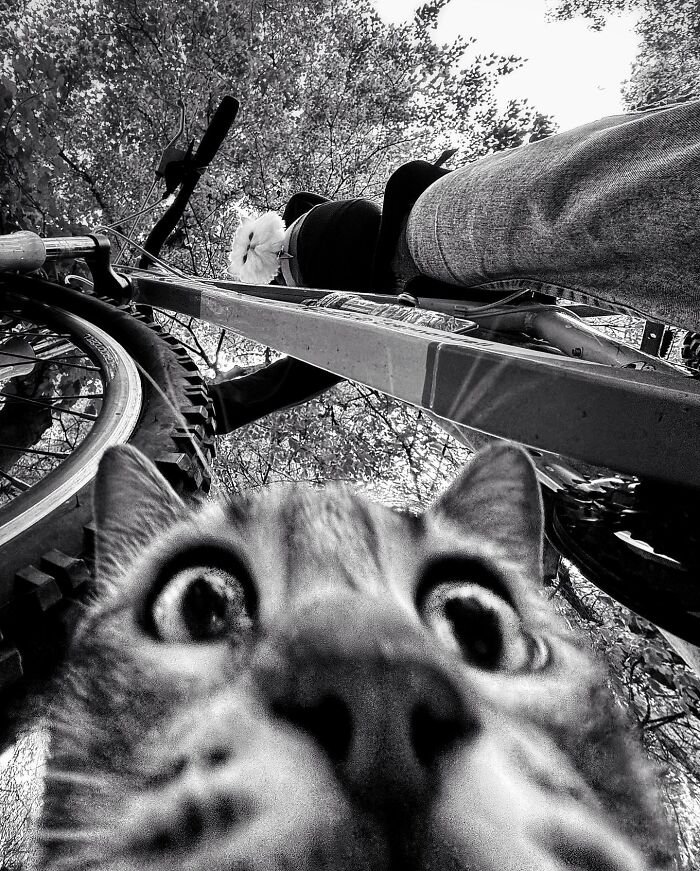 Sous le vélo et le premier chat perché, le second chat observe, témoin amusé d’un instant improbable.