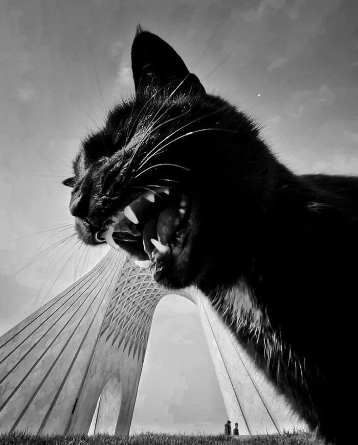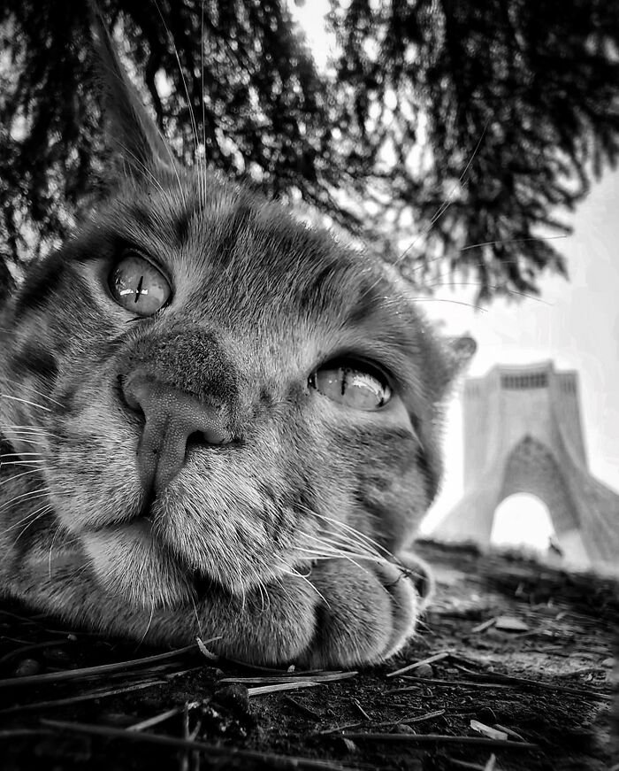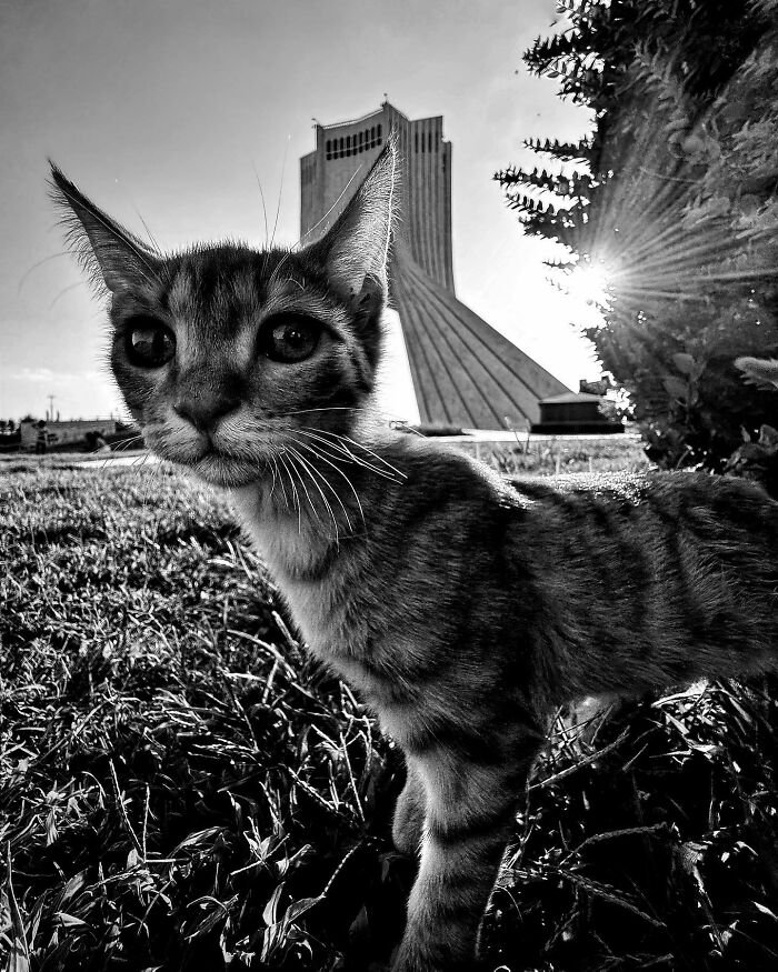 « Pris en contre‑plongée, ce chat curieux semble défier la verticalité de la ville. Le jeu de perspective transforme la tour en prolongement de sa silhouette, comme si Téhéran se construisait autour de lui. »
