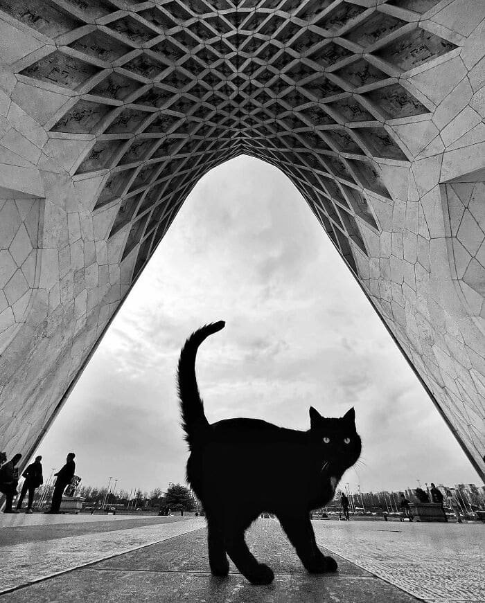 « Sous l’ombre monumentale de la tour Azadi, ce chat avance avec l’assurance d’un habitant légitime de Téhéran. Une rencontre où l’architecture iconique et la vie urbaine se croisent dans un même élan. »